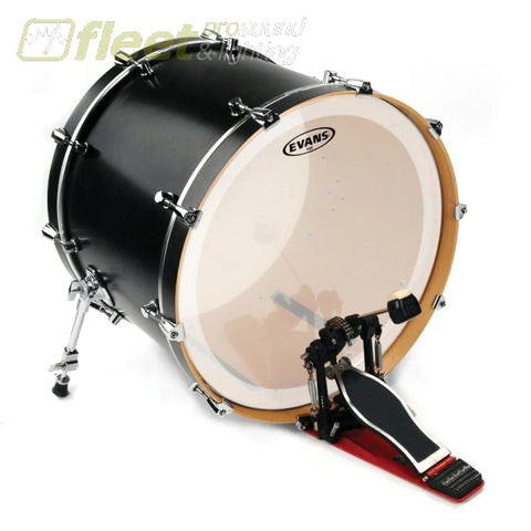 Evans EQ4 series features a single ply of 10mil film. A fixed internal overtone control ring focuses the tonal response of the drum. This version features a bass hoop to accommodate standard bass drum counter hoops.