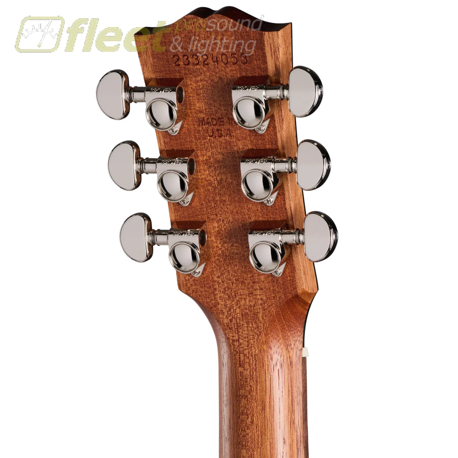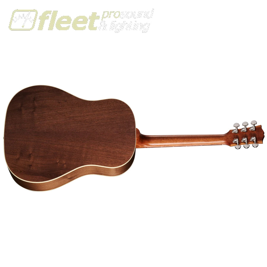 The J-45™ was first released in 1942. It became widely known as “The Workhorse” due to its no-nonsense simplicity and understated elegance. It is Gibson’s best-selling acoustic guitar model of all time and one of the most recorded acoustic guitars in history, and it has graced countless recordings and concert stages in the hands of artists across a wide range of genres. Now, Gibson is proud to introduce the updated J-45 Studio Walnut. The J-45 Studio Walnut is handcrafted in Bozeman, Montana, using all-solid tonewoods, including a gloss nitrocellulose lacquer-finished Sitka spruce top for wide dynamic range, playing responsiveness, and balanced tone. The satin nitrocellulose lacquer-finished walnut used for crafting the back and sides delivers a balanced tonal response that is warm and rich-sounding with a bit more bass and treble than the traditional mahogany-bodied J-45 models but not quite as much as the rosewood-bodied versions. The J-45 Studio Walnut’s full-depth, round shoulder body ensures rich, deep tone and outstanding volume and projection. The J-45 Studio Walnut is equipped with an Advanced Response profile and satin nitrocellulose lacquer-finished utile neck for smooth, easy playability. The Advanced Response neck profile sits in between some of the other Gibson neck profiles and is not too large or too thin but fits “just right” in the hand for many players. The walnut fretboard has 20 standard-sized frets and is adorned with the simple mother-of-pearl dot inlays, one of the visual hallmarks of the iconic J-45. The fretboard’s 16” radius makes playing fast note runs easy and efficient, contributing further to the model’s excellent playability. You’ll find yourself reaching for this guitar again and again since playing it is so much fun. The headstock is equipped with smooth-turning Grover® Rotomatic® tuning machines and a Graph Tech® TUSQ® nut for rock-solid tuning stability so you can spend more time playing and less time tuning. The saddle and bridge pins installed on the belly-up bridge plate are also TUSQ. The J-45 Studio Walnut has an L.R. Baggs™ Element Bronze active under-saddle piezo pickup with a quick-to-access soundhole-mounted volume control for easy studio-quality plug-and-play anywhere. Packaged in a modern hardshell case for portability and protection, the J-45 Studio Walnut is ready to join you wherever your muse takes you.