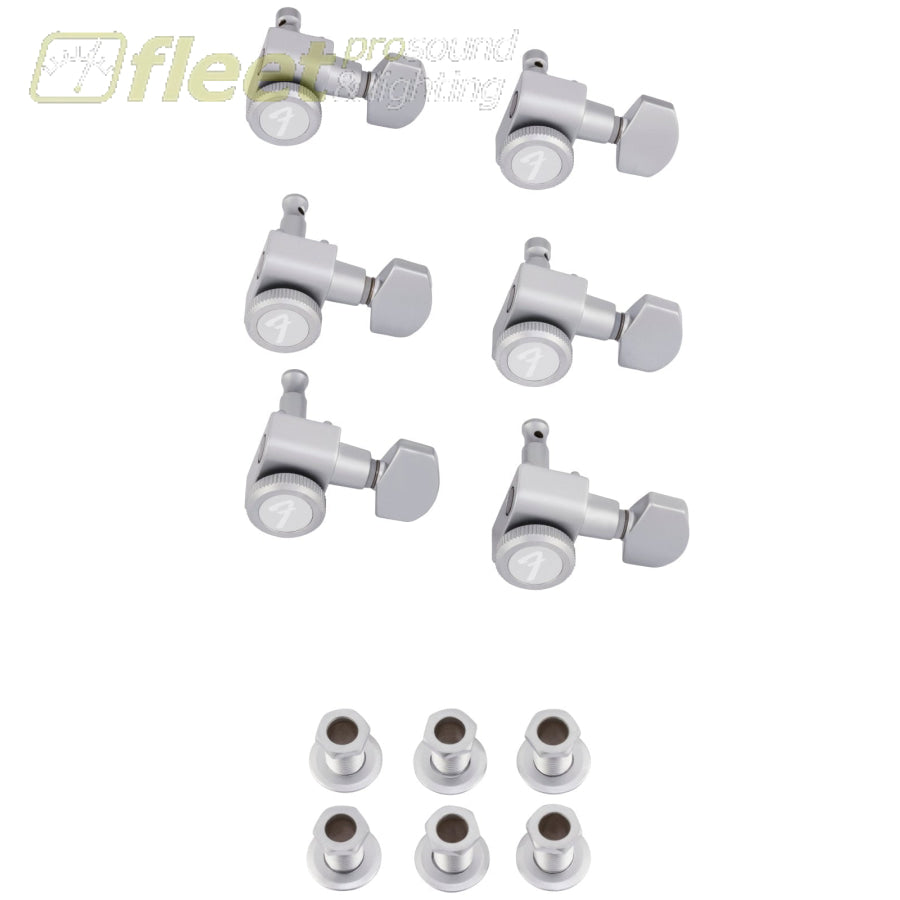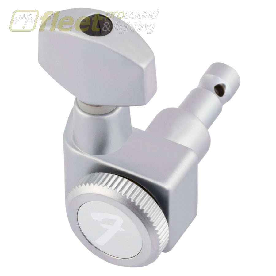 Set of six locking tuners designed to fit most modern-style Fender electric guitars with dual-pin mounting configuration. Tall post tuners are used for the wound strings and shorter post tuners are used for the plain strings. Staggered tuners increase the break angle over the nut and improve tuning stability.
