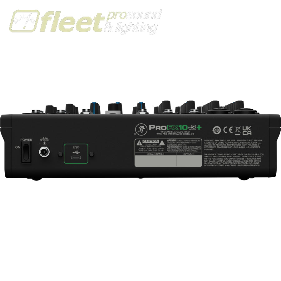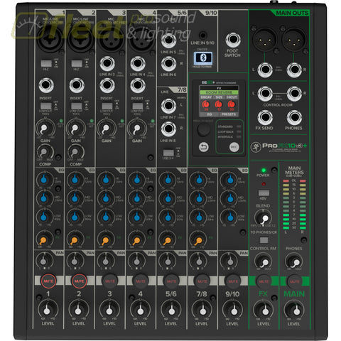 Mackie ProFX10v3+ is a professional analog mixer and USB-C audio interface with powerful enhancements for studio-quality recordings and live streams. Capture your performance with Onyx preamps and channel EQ, add computer audio via loopback, bring in calls via Bluetooth® and enhance your sound with upgraded GigFX+ effects on a color LCD screen.