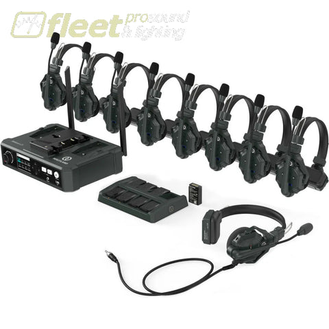 The Hollyland Solidcom C1-HUB8S is a full-duplex wireless DECT intercom system engineered to provide clear audio and all-day wearing comfort in a true-wireless design with no bodypack required. This configuration includes eight single-sided remote wireless headsets along with eight rechargeable batteries, a charger, the C1 HUB base with wired headset, and accessories. The system uses DECT 6.0 encryption and dual-antenna technology to ensure secure and reliable transmission at a range of up to 1000'—making it well suited for a variety of applications, including film production, concerts, and public events.