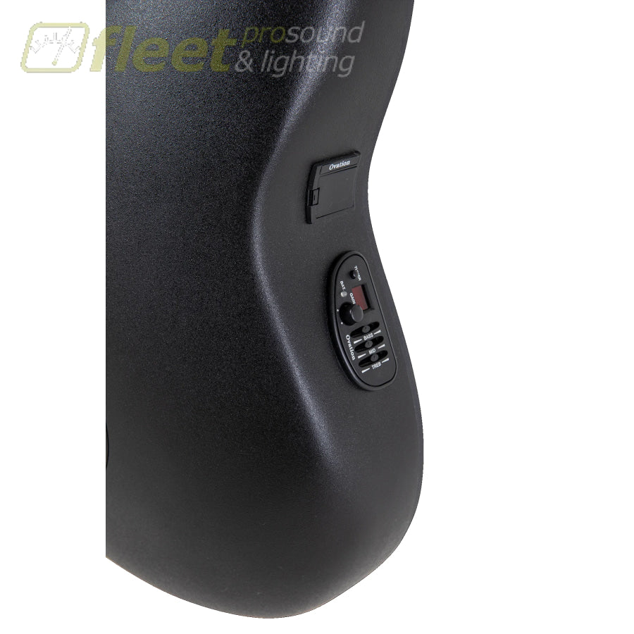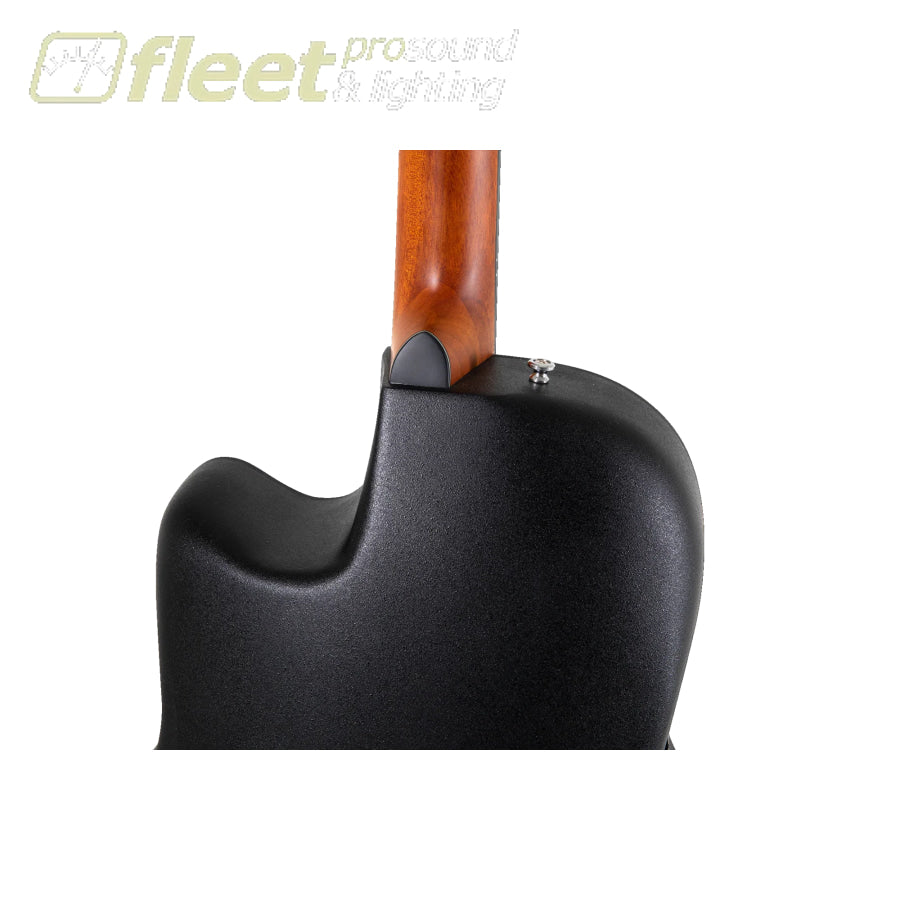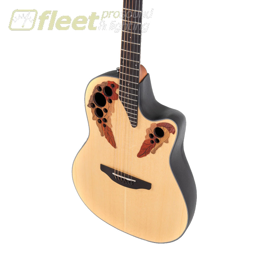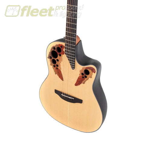 The Celebrity Elite series is your first step into the world of Ovation’s classic multi-soundhole instrument design, with first-rate sound, style, features and value. The Celebrity Elite CE44-4 guitar has the classic mid-depth Lyrachord cutaway body with a solid spruce top featuring the Elite multisoundhole design, which provides clear highs and focused, balanced bass response. For the top’s quartersawn scalloped “X” bracing, we reviewed earlier Ovation bracing patterns extensively and arrived at a remarkable new design that borrows from the past and is voiced for the present, with natural tone and optimal response and power. Together, body, top and soundholes create the classic Ovation Elite sound, resonating with full projection, remarkable note clarity and balance, and nuanced tonal complexity. The top also has elegant multi-wood epaulets, black binding and a beautiful Natural gloss finish. Other premium features include an effortlessly playable satin-finish neck, 10”-radius rosewood fretboard with 20 fully accessible frets (24 frets for high E string) and pearloid inlays, and a rosewood bridge. For great live sound, the CE44-4 features an Ovation Slimline pickup and OP-4BT preamp system with three-band EQ, volume/gain control, onboard tuner and low-battery light.